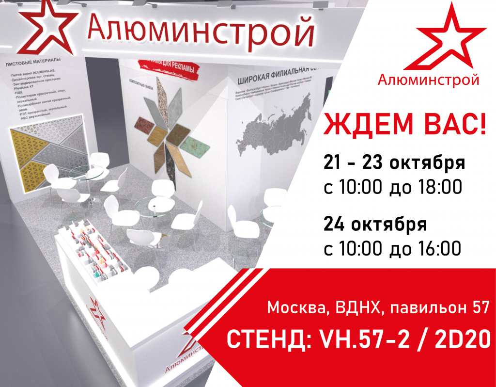 С 21 по 24 октября 2025 года компания Алюминстрой примет участие в 32-й международной специализированной выставке «РЕКЛАМА-2025», проходящей в Москве, на ВДНХ, в Павильоне 57 (Россия — моя история). Мы приглашаем партнёров, клиентов и всех заинтересованных специалистов посетить наш стенд и познакомиться с новыми решениями в сфере рекламных материалов!